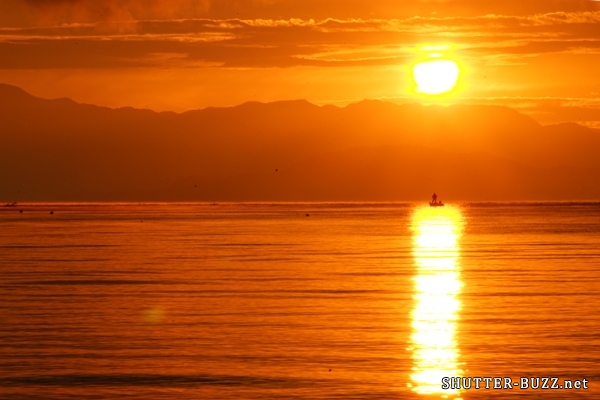水面に出来た朝日が照らす光の道に乗っかる釣り人。