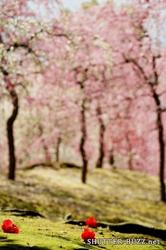 苔の絨毯に落ちた椿の花と背景に広がる梅シャワー – SONY α7(ILCE-7)撮影