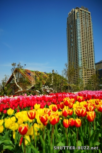 高層ビルと欧風建築が隣接する異空間に広がるチューリップ畑 – SONY α7(ILCE-7)撮影