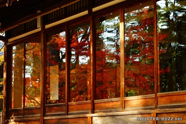 書院の入口から距離のある床紅葉。 裏側は、窓ガラスに反射する真っ赤に燃ゆる紅葉。