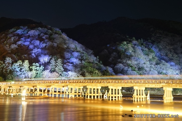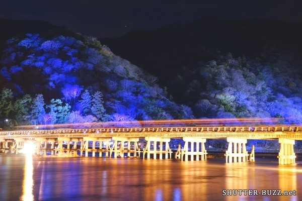 幻想的にライトアップされた嵐山、渡月橋を走る光のライン – SONY α7(ILCE-7)撮影