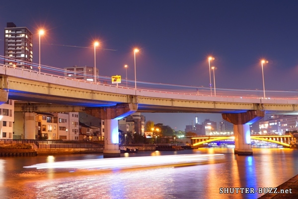 観光船が通過するタイミングを狙ってスローシャッター撮影していたら、高速道路を通過する背の高いバスかトラックが光跡を残してくれたのと同時に、高速道路の照明灯の向こ…