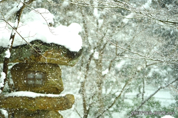 雪の白髭神社、雪ボケ写真の撮影に成功。