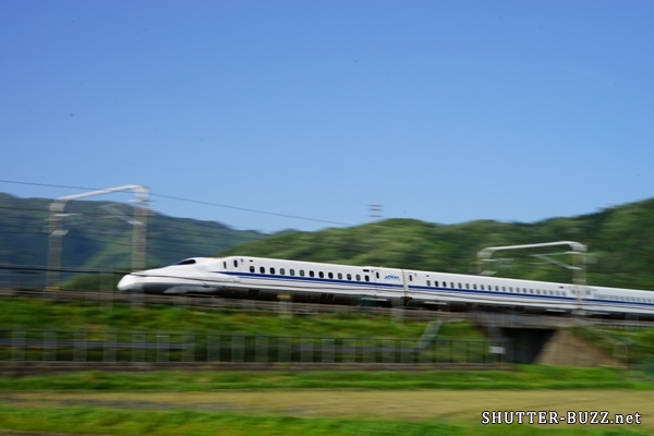 シャッタースピードは1/50秒に設定。あとは走る新幹線にあわせるだけ。