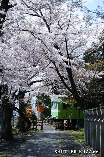 線路両脇の桜並木をくぐり抜けて来た車両はレトロなモボ21形27号車