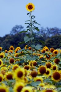 10月の秋空に、秋桜畑の中で元気に咲く向日葵。