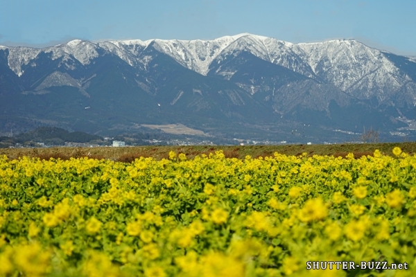 冠雪の山を背景に咲き誇る菜の花畑。